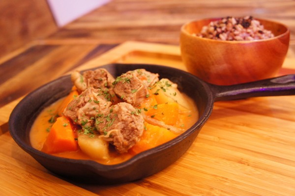 香氣四溢的鄉村燉牛肉,裡頭是燉到軟爛的紅蘿蔔、馬鈴薯和牛勒條,牛肉熟透到幾乎不用多花力氣咀嚼,